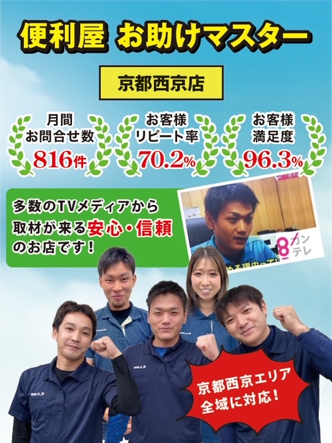 この度は便利屋お助けマスター京都西京店にお越しくださり誠にありがとうございます。当社では 「格安」 や 「激安」を売りにしているわけではなく、決して大手の便利屋さんでもありません。しかし、そんな中から当社をお選びいただけたお客様には必ず笑顔になっていただけるサービスと接客をお約束いたします。